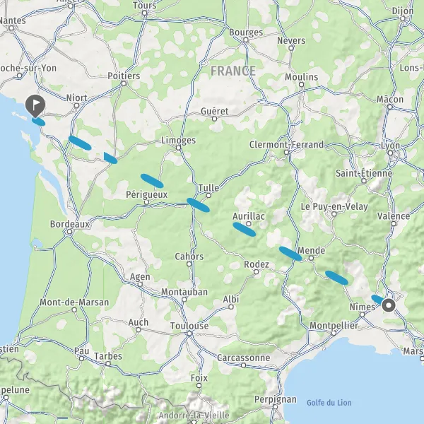 Venir à La Rochelle. Par la route : Paris : 467 km, Lyon : 650 km, Marseille : 825 km, Nantes : 146 kmBordeaux : 180 km, Toulouse : 400 kmset Strasbourg : 950 km. Par le train : Paris-La Rochelle : 3h en TGV et Bordeaux-La Rochelle / Nantes-La Rochelle : 2h en train Intercités.Se déplacer à La Rochelle : le bus de mer (une ligne régulière entre le Vieux Port et les Minimes), le passeur (liaison entre la médiathèque et le Vieux Port), location de vélos, location de voitures électriques (Yélomobile), en bus (réseau de 25 lignes de bus desservant la ville et ses alentours proches), taxis, VTC, liaisons maritimes (Bac Fouras / Aix, liaison maritime La Rochelle - Boyardville).