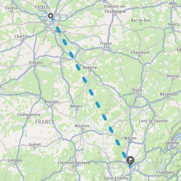 Venir à Lyon. En train : avec deux gares en centre ville, Part-Dieu et Perrache et une troisième dans l'aéroport Lyon Saint Exupéry, le TGV place aujourd'hui Lyon au centre de l'Europe. À 2h de Paris (1 train toutes les 30 minutes), 1h40 de Marseille (22 aller-retour quotidiens), 3h de Lille, 4h30 de Nantes, 5h de Londres (par l'Eurostar) et 5h10 de Barcelone, le TGV dessert aussi Chambéry, Annecy ou Bruxelles. En voiture : la ville est au centre d'un réseau routier dense de plus de 1000 km, qui la relie à toutes les grandes villes d'Auvergne-Rhône-Alpes, et aux grandes villes européennes. De Genève, vous êtes à Lyon en 1 h 40, de Clermont-Ferrand en 2 heures, des stations des Alpes en 2 h 15, de Marseille en 3 heures, de Paris en 4 h 20. En bus avec les compagnies de transports en commun de la région urbaine de Lyon, avec BlaBlaBus et Flixbus. En avion : il y a deux aéroports à Lyon : l'Aéroport international de Lyon Saint-Exupéry et l'aéroport d'affaires de Lyon-Bron. Le service de Tram Rhônexpress relie Lyon Part-Dieu à l'aéroport de Lyon Saint-Exupéry en moins de 30 minutes. Se déplacer à Lyon : transports urbains (metro, bus, tram, taxi et funiculaire), vélos en libre service avec Velo'v (4 000 vélos répartis sur 300 stations à Lyon et Villeurbanne), Vaporetto (navette fluviale sur la Saône), Cyclopolitain (vélo-taxi), Citiz (voiture électrique en libre-service).