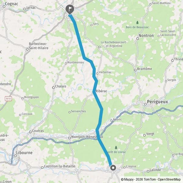 Au rond-point, prendre la 2ème sortie sur D709 (Route de Riberac) et continuer sur 10 kilomètres