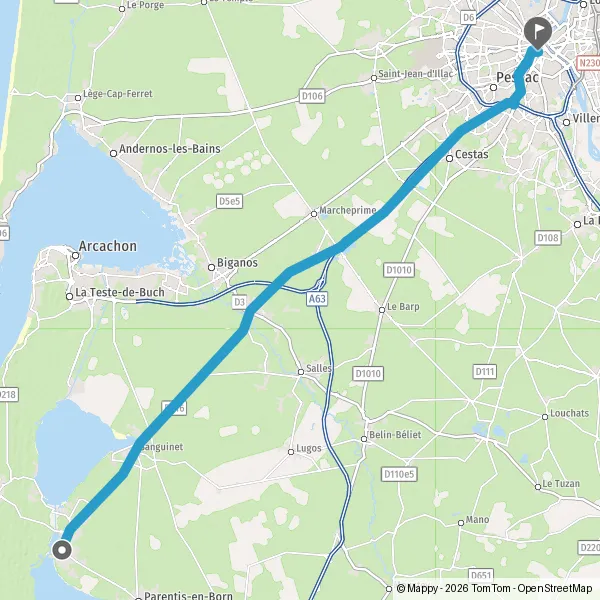 Prendre à droite et rejoindre A63 E5 E70. Continuer sur 21 kilomètres