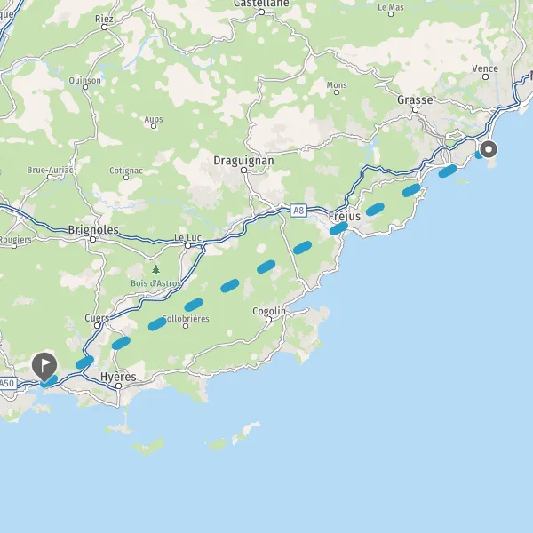 Venir à Toulon. Par la route : en arrivant par l'ouest: par l’autoroute A50 en provenance de Marseille, Aix en Provence, Lyon ou Paris, par la route départementale D 559 en provenance de la Seyne sur Mer, par la route départementale D N8 en provenance d’Ollioules. En arrivant par l'est: par l’autoroute A50 en provenance de Nice ou Hyères, par les routes départementales D 559 ou D 42 (route du littoral) en provenance du Pradet, Carqueiranne ou Giens. En autocar: avec les bus du réseau Mistral. En bateau : la compagnie de navigation maritime privée ""Corsica Ferries"" assure des liaisons entre Toulon et les ports d'Ajaccio, de Bastia et de l'Île Rousse. En train : la gare est située au centre de Toulon et à proximité de la gare routière. En avion : Toulon est desservi par l'Aéroport International Toulon-Hyères. Il se trouve à environ 20 minutes du centre de Toulon.Se déplacer à Toulon : en navettes maritimes, en bus (réseau Mistral), à vélo (voies vertes, bandes et pistes cyclables), à pied, en voiture, en covoiturage (2 aires de covoiturage) ou en taxi.
