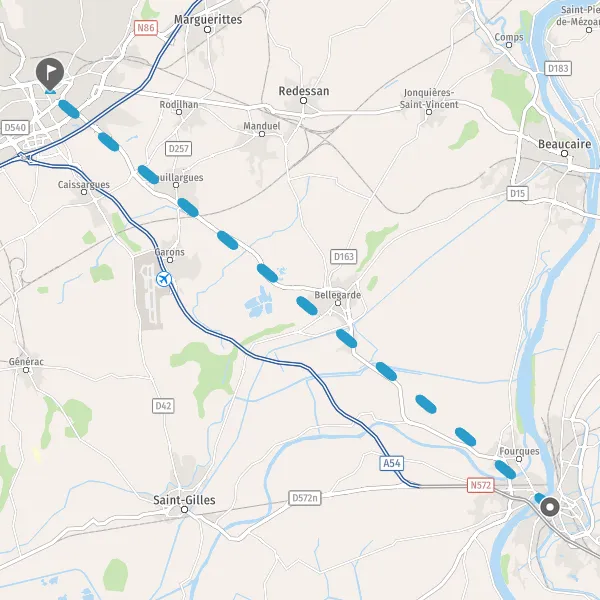 Venir à Nîmes. En avion : l'Aéroport international Nîmes-Alès-Camargue-Cévennes est à 15 km du centre ville. En train: trajets Paris / Nîmes au départ de la Gare de Lyon (durée : 3h00) et au départ de l'aéroport Roissy Charles de Gaulle (durée : 3h30). Lignes Bruxelles / Nîmes (durée 5h25). En voiture : depuis Montpellier ou Orange prendre l'Autoroute A9 ""La Languedocienne"". Depuis ARLES, prendre l'A54, depuis MARSEILLEsles autoroutes A7 - E80 - A54 (Trajet : 1h10), depuis LYON l'A7 puis A9 (Trajet : 2h16), depuis TOULOUSE l'A61 puis A9 (Trajet : 2h32). Autoroute A7 ""Autoroute du Soleil"" sortie Bollène pour accès Vallée de la Cèze et Cévennes.Se déplacer à Nîmes : en transports en commun, en voiture, en covoituarge avec covoiturage.gard.fr , en vélo (l'espace VéloTANGO en Gare propose 330 vélos à la location et 110 places de consigne sécurisées) ou à pied.