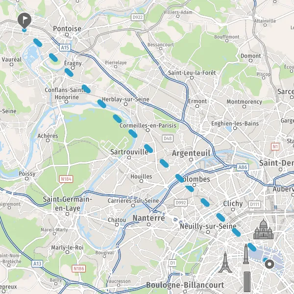Venir à Pontoise. En train : Pontoise se situe à 30 km au nord-ouest de Paris. On peut s’y rendre par le train à partir de Paris par la gare du Nord ou la gare Saint-Lazare, et depuis 2000 par le RER C dont le terminus est à Pontoise. En voiture : par la route, Pontoise est au croisement de l’autoroute A15, prolongée en direction de Rouen par la RD14, et de la Francilienne (rocade de l’Île de France) qui permet de rejoindre l’A16, l’A1 et l’aéroport Roissy Charles-de-Gaulle au nord, l’A14, Saint-Germain-en-Laye et Versailles au sud. Par avion, l’aéroport international Roissy Charles-de-Gaulle est à une demi-heure de Pontoise par la Francilienne.sSe déplacer à Pontoise : en voiture, en bus avec le réseaux Stivo et Busvaldoise, en vélo ou à pied.
