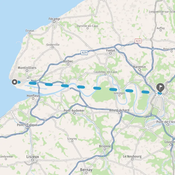 Venir à Rouen. En voiture : au sud, pour venir en voiture à Rouen, la ville est reliée à Paris par l’autoroute A13 (130km), qui se trouve à un peu plus d’une heure en voiture. La métropole rouennaise est rattachée Caen, Deauville, Honfleur, le Mont-Saint-Michel ou Rennes et à la Bretagne par la même autoroute. À l’ouest, la ville est accessible depuis Le Havre, Fécamp ou Etretat par l’autoroute A29 en passant par Barentin. Au nord, Rouen est en relation directe avec l’Angleterre, Lille, Calais, à Tours, Bordeaux, Amiens ou Reims par l’autoroute A28 et le tunnel sous la Manche. En train : la Gare de Rouen SNCF est desservie par de nombreux trains en provenance de destinations nationales comme Paris, Le Havre, Marseille, Lyon, Lille ou régionales comme Le Havre, Vernon, Caen et Dieppe. La Gare de Rouen SNCF se trouve en centre-ville, sur la rive droite. Se déplacer à Rouen : en transports en commun (le métro, le TEOR, le bus), en vélo libre service avec Cy'clic (22 stations et 220 vélos), à pied, en voiture et par voie fluviale. Des bacs effectuent la traversée du fleuve sur les boucles de la Seine (Sahurs, La Bouille, Duclair, etc…).