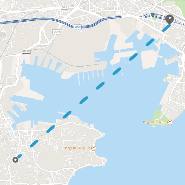 Venir à Toulon. Par la route : en arrivant par l'ouest: par l’autoroute A50 en provenance de Marseille, Aix en Provence, Lyon ou Paris, par la route départementale D 559 en provenance de la Seyne sur Mer, par la route départementale D N8 en provenance d’Ollioules. En arrivant par l'est: par l’autoroute A50 en provenance de Nice ou Hyères, par les routes départementales D 559 ou D 42 (route du littoral) en provenance du Pradet, Carqueiranne ou Giens. En autocar: avec les bus du réseau Mistral. En bateau : la compagnie de navigation maritime privée ""Corsica Ferries"" assure des liaisons entre Toulon et les ports d'Ajaccio, de Bastia et de l'Île Rousse. En train : la gare est située au centre de Toulon et à proximité de la gare routière. En avion : Toulon est desservi par l'Aéroport International Toulon-Hyères. Il se trouve à environ 20 minutes du centre de Toulon.Se déplacer à Toulon : en navettes maritimes, en bus (réseau Mistral), à vélo (voies vertes, bandes et pistes cyclables), à pied, en voiture, en covoiturage (2 aires de covoiturage) ou en taxi.