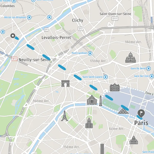 Venir à Paris. Paris est desservie par 6 gares situées en plein centre. De ces points, on peut prendre le métro ou monter dans l’un des taxis qui stationnent devant chaque gare. Pour les arrivées aux aéroports, plusieurs moyens de transport permettent de rejoindre le centre de la capitale (Cars Air France, Orlyval, RoissyBus, la ligne 14 du métro). En car : plusieurs compagnies desservent la capitale: BlaBlaCar et Flixbus. En bateau : pour arriver en bateau à Paris, il faut accoster au port de l’Arsenal. Se déplacer à Paris : en transports en commun (bus, métro, RER, tramway), en taxi ou en VTC, à vélo (700 km de voies cyclables) ou en vélo libre service avec Vélib', en transports insolites (cabriolet, ""cab"" anglais, limousine, vélo électrique), en Batobus (9 escales pour découvrir Paris), en covoiturage ou en voiture en libre service avec Clem, Communauto, Zity, ShareNow et Free2Move, en voiture ou à pied.