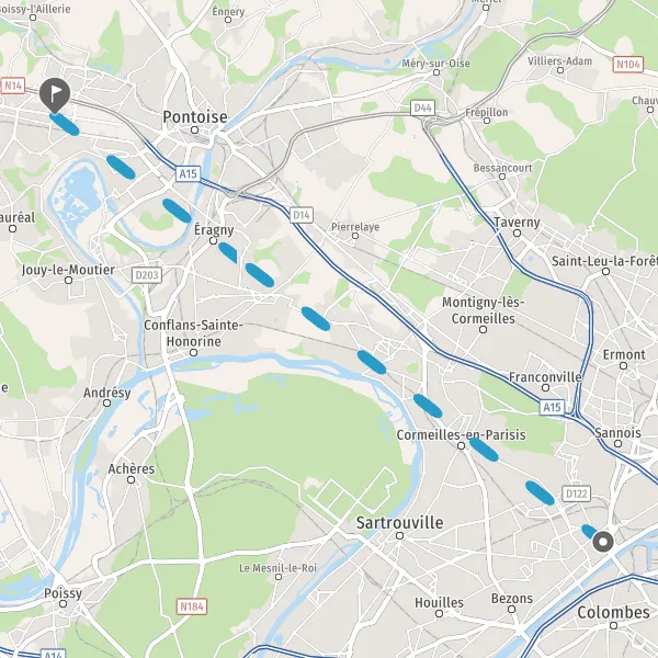 Venir à Pontoise. En train : Pontoise se situe à 30 km au nord-ouest de Paris. On peut s’y rendre par le train à partir de Paris par la gare du Nord ou la gare Saint-Lazare, et depuis 2000 par le RER C dont le terminus est à Pontoise. En voiture : par la route, Pontoise est au croisement de l’autoroute A15, prolongée en direction de Rouen par la RD14, et de la Francilienne (rocade de l’Île de France) qui permet de rejoindre l’A16, l’A1 et l’aéroport Roissy Charles-de-Gaulle au nord, l’A14, Saint-Germain-en-Laye et Versailles au sud. Par avion, l’aéroport international Roissy Charles-de-Gaulle est à une demi-heure de Pontoise par la Francilienne.sSe déplacer à Pontoise : en voiture, en bus avec le réseaux Stivo et Busvaldoise, en vélo ou à pied.