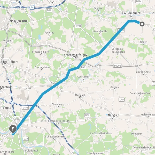Au rond-point, prendre la 2ème sortie sur D402 (Route de Coulommiers) et continuer sur 3 kilomètres