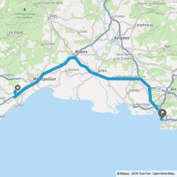 Avec le mode voiture, vous pouvez configurer vos options (type de véhicule, autoroute ou non, péage ou non, distance la plus courte), tout en ayant accès aux infos de circulation grâce à notre service d'info-trafic en temps réel. Ainsi faites des économies sur le coût ou la durée de votre voyage, en trouvant le trajet Cournonterral Marseille adapté à vos besoins.