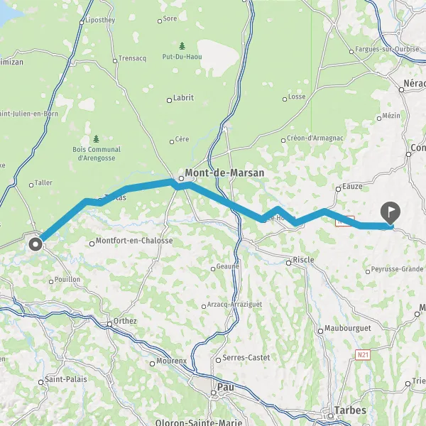 Au rond-point, prendre la 1ère sortie sur D30 (Avenue du Houga) et continuer sur 22 kilomètres