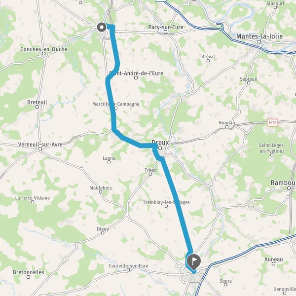 Prendre à droite et rejoindre N154 (Route de Chartres). Continuer sur 27 kilomètres