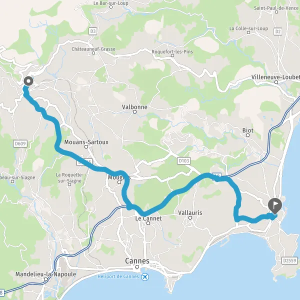 Au rond-point, prendre la 3ème sortie sur D103 (Route d'Antibes) et continuer sur 2 kilomètre