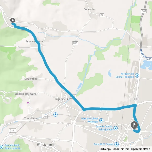 Avec le mode voiture, vous pouvez configurer vos options (type de véhicule, autoroute ou non, péage ou non, distance la plus courte), tout en ayant accès aux infos de circulation grâce à notre service d'info-trafic en temps réel. Ainsi faites des économies sur le coût ou la durée de votre voyage, en trouvant le trajet Kaysersberg-Vignoble Colmar adapté à vos besoins.