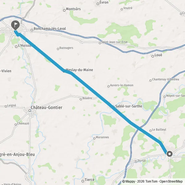 Au rond-point, prendre la 1ère sortie sur D21 (Rue de Sablé) et continuer sur 2,8 kilomètres