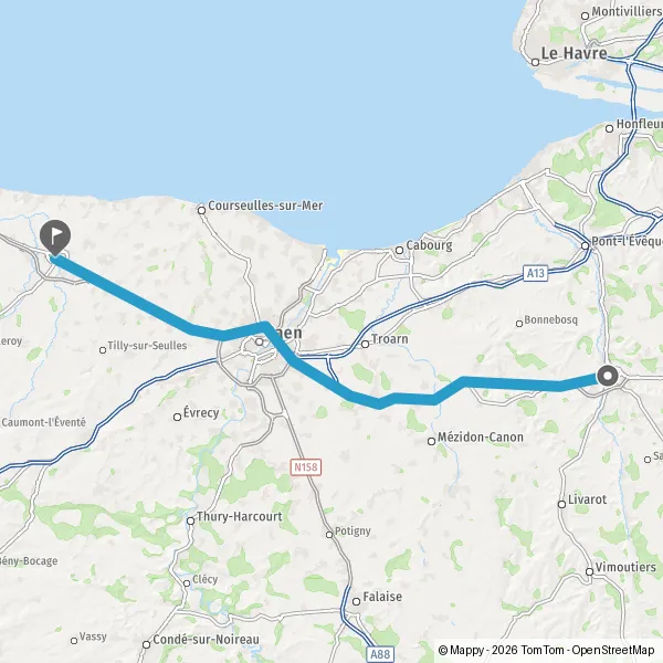 Au rond-point, prendre la 1ère sortie sur D613a (Route de Caen) et continuer sur 2,8 kilomètres