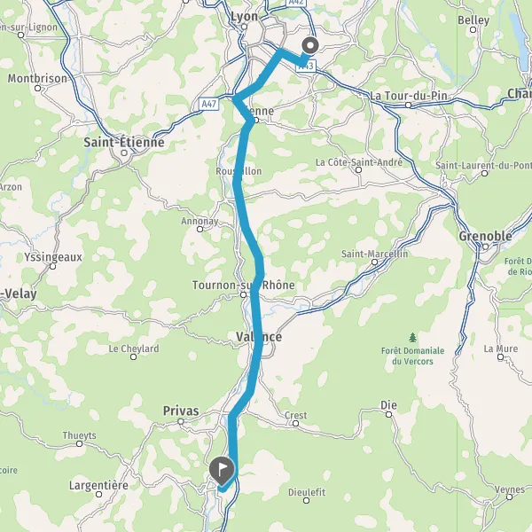 Prendre à gauche et rejoindre A46 E15 E70. Continuer sur 21 kilomètres