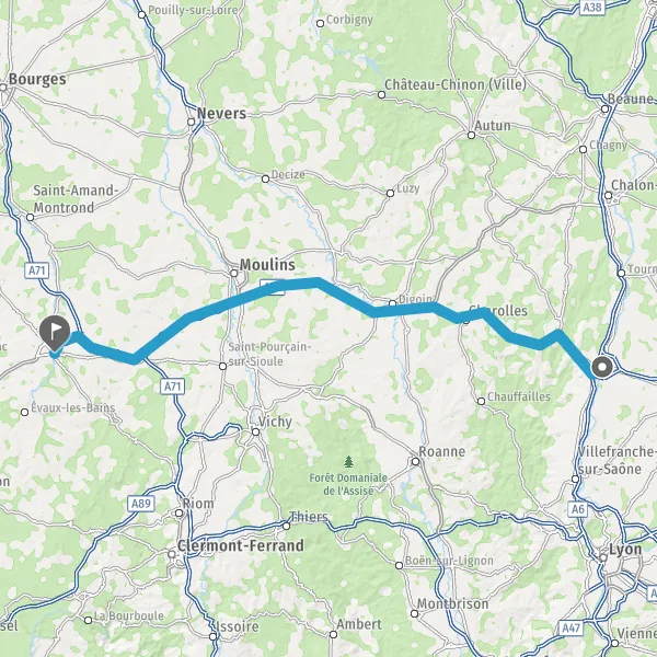 Prendre un ticket (Péage Molinet Est) Payer 1,30 € (Péage Molinet Ouest) Prendre un ticket (Péage Montbeugny Est) Payer 1,90 € (Péage Montbeugny Ouest) Prendre un ticket (Péage Le Montet Est) Payer 1,00 € (Péage Le Montet Ouest) Prendre un ticket (Péage Deux chaises) 68 km