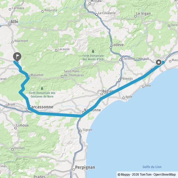 Au rond-point, prendre la 2ème sortie sur D118 (Avenue de la Montagne Noire) et continuer sur 36 kilomètres