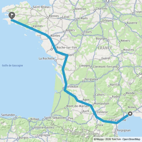 Comment aller de Montpellier (34000) à Quimper (29000) en voiture ?