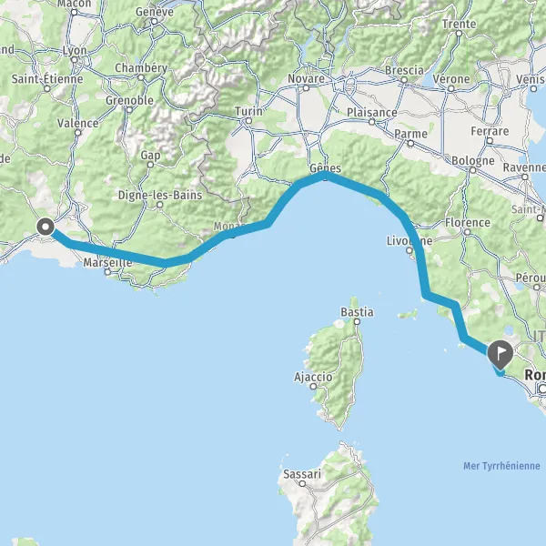 Tourner légèrement à droite sur E80 SS1 SS1 SS1 SS1 Strada 1 Strada 1 Strada 1 Strada 1 (Via Aurelia) et continuer sur 20 kilomètres
