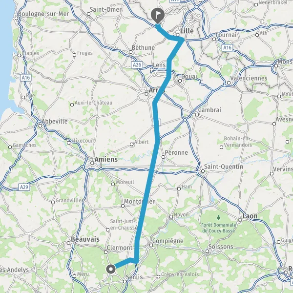 Prendre à droite et rejoindre D1016 (Route Nationale de Paris à Lille). Continuer sur 850 mètres