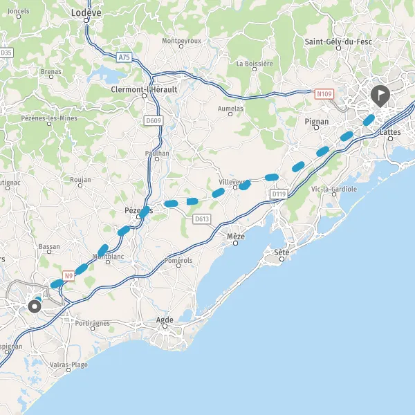 Tourner légèrement à gauche sur N9 (Route de Pézenas) et continuer sur 1,5 kilomètre