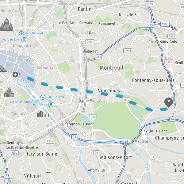 Au rond-point, prendre la 5ème sortie sur Avenue de la Porte de Vincennes et continuer sur 1 kilomètre