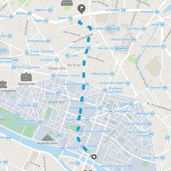 Itinéraire en pieton de Paris 75001-75116 à 36 Boulevard Marguerite de Rochechouart, 75018 Paris