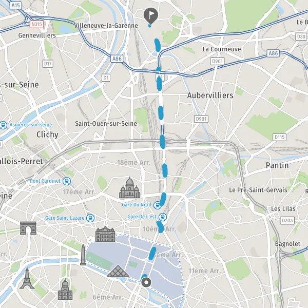 Tourner légèrement à droite sur D931 (Avenue de la Porte de la Chapelle) et continuer sur 3,3 kilomètres
