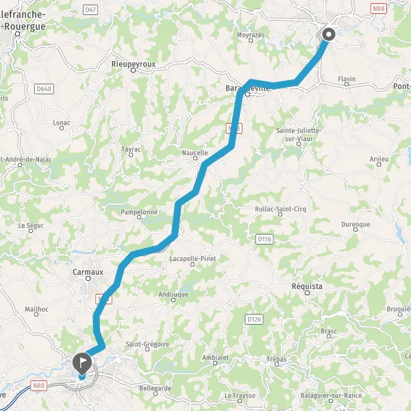 Au rond-point, prendre la 3ème sortie sur N88 (Route d'Albi) et continuer sur 2,1 kilomètres