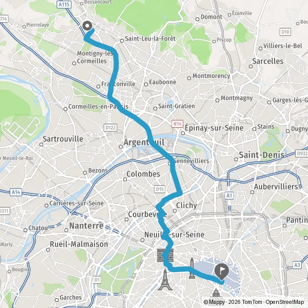 Prendre à droite et rejoindre A115. Continuer sur 3,3 kilomètres