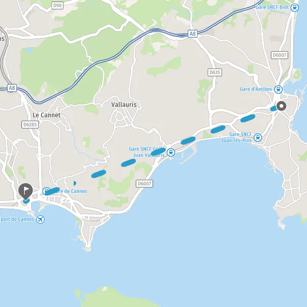 Ne perdez plus votre temps à chercher un billet de train pas cher, Mappy vous permet de comparer tous les prix et tous les horaires pour réserver votre train de Antibes à Cannes avec nos partenaires : SNCF, Ouigo. Comparez votre trajet Antibes Cannes en train, entre différentes lignes ou avec les autres modes de transports, et calculez ainsi l'économie de temps et de coût réalisée.