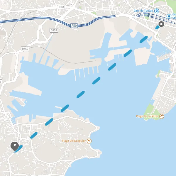 Venir à La Seyne sur Mer. En voiture : En venant de Lyon : A7 sortie raccordée sur A50, sortie n°12 Bandol ou n°13 La Seyne Ouest / Six Fours / Ollioules. En venant de Nice : A8 puis A57 jusqu’à Toulon et A50 sortie n°13 La Seyne Ouest / Six Fours / Ollioules. En train : prendre le train jusqu'à Toulon. Liason en bus depuis la gare de Toulon: Réseau Mistral, bus Ligne 18 ou bus Ligne 7 puis bateau 18M ou 8M.sSe déplacer à La Seyne sur Mer : pour découvrir La Seyne-sur-Mer, plusieurs modes de déplacementssont disponibles: bus, voiture, un petit train touristique, des vélos (www.mabicyclettebleue.com) ou des taxis.