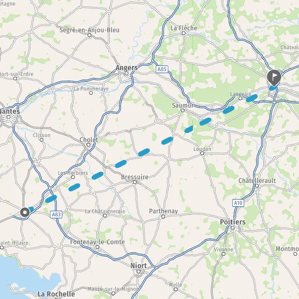 Venir à Tours. En voiture : 3 autoroutes desservent la Touraine : l’A10 (entre Paris et Bordeaux), l’A28 (entre Rouen et Tours) et l’A85 (entre Nantes et Bourges). Voici quelques indications de distances pour rallier Tours : Nantes (222 km), Paris (238 km), Rennes (242 km), Rouen (274 km), Bordeaux (348 km), Dijon (419 km), Lille (460 km), Lyon (463 km), Toulouse (525 km), Montpellier (664 km), Marseille (798 km), Nice (955 km). En autocar : la ville de Tours est desservie par autocar via les compagnies BlaBlaCar et ou Flixbus. En train : comptez 1h de TGV pour faire le trajet entre la gare de Paris Montparnasse et la gare de Tours / Saint-Pierre-des-Corps. D’autres liaisons directes sont proposées avec l’Ile-de-France : Massy (aéroport d’Orly), Marne-la-Vallée (Disneyland) et l’aéroport Roissy-Charles de Gaulle.Se déplacer à Tours : en vélo avec Velociti (service de location de vélo longue durée) ou avec Indigo Weel (vélos en libre-service), en transports en commun (la ville de Tours est desservie par le service de tram et bus de l'agglomération ""Fil bleu"" et le réseau départemental ""Fil vert""), en covoiturage avec covoiturons-en-touraine.com , en autopartage avec Citiz Tours (service de location de voiture en libre-service de courte durée), en taxi ou à pied.