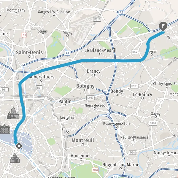 | Distance en transports en commun | 18,8 km à 22,3 km |