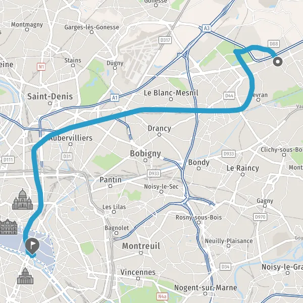| Distance en transports en commun | 18,8 km à 19,8 km |