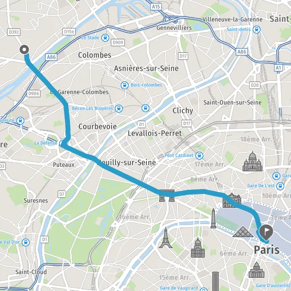 | Distance en transports en commun | 13,6 km à 13,8 km |
