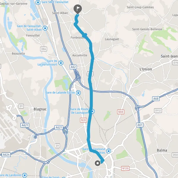 Prendre légèrement à droite la piste cyclable Route de Launaguet et continuer sur 55 mètres