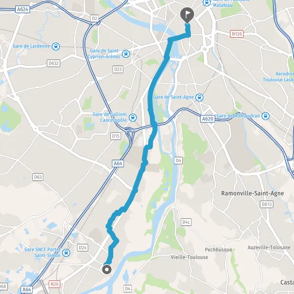 Prendre à gauche la piste cyclable Allée des Moulins de la Garonne et continuer sur 2,1 kilomètres