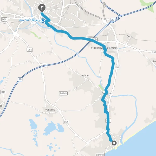 Prendre à droite Chemin des Flottes à Sérignan et continuer sur 2,7 kilomètres