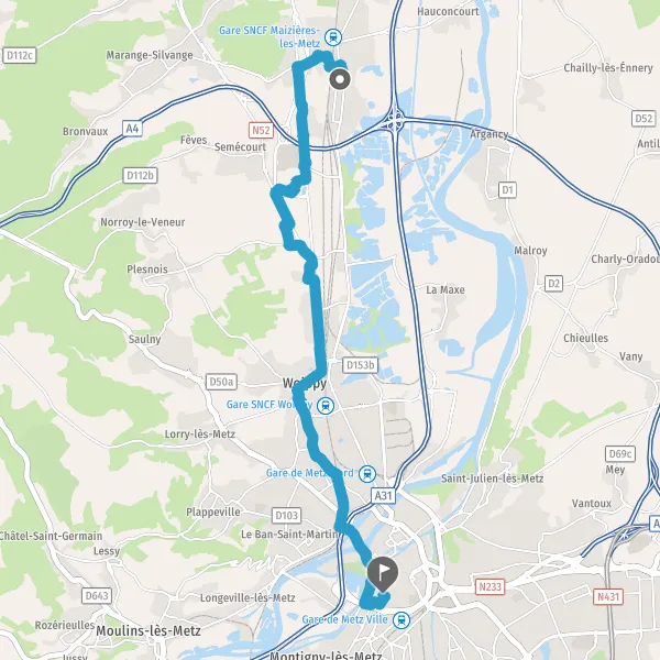 Au rond-point, prendre la 2ème sortie la voie partagée Route de Woippy et continuer sur 500 mètres
