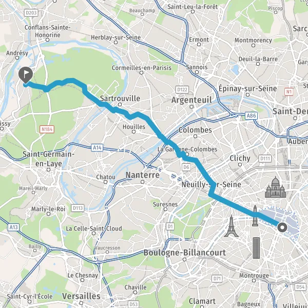 Prendre à gauche Route du Clocher d'Achères et continuer sur 1,2 kilomètre