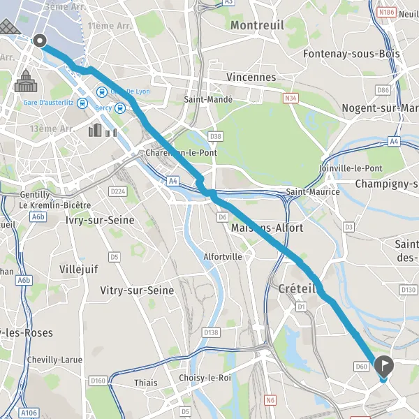Prendre légèrement à droite la voie partagée Rue de Charenton et continuer sur 1,0 kilomètre