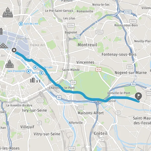 Prendre à droite la piste cyclable Avenue de Gravelle et continuer sur 1,9 kilomètre
