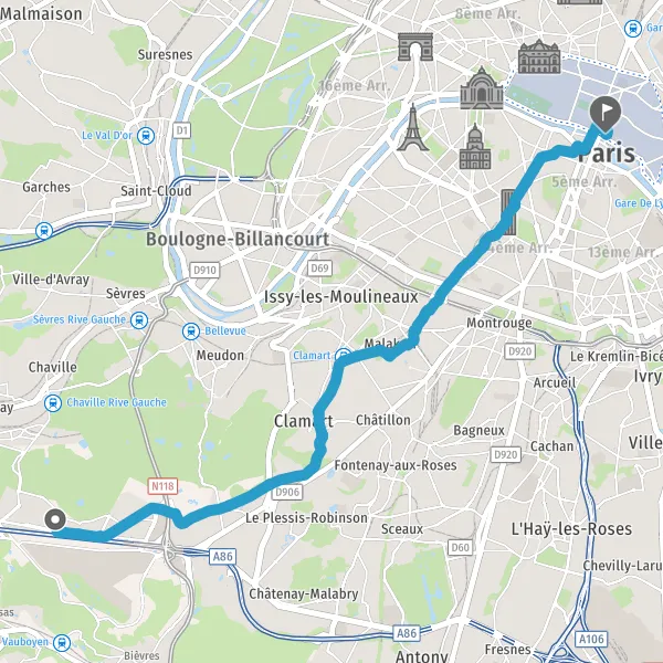 Au rond-point, prendre la 1ère sortie la piste cyclable Rue de la Porte de Trivaux et continuer sur 750 mètres