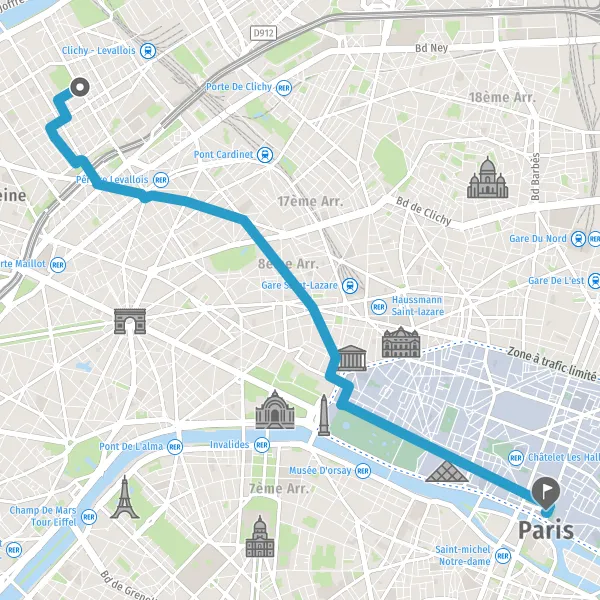 | Distance à vélo | 7,1 km à 7,6 km |