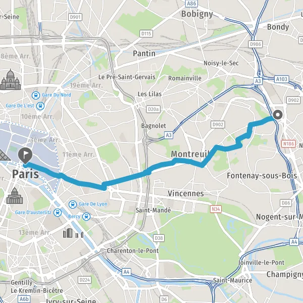 Prendre à droite la piste cyclable Avenue de la Porte de Montreuil et continuer sur 1,1 kilomètre