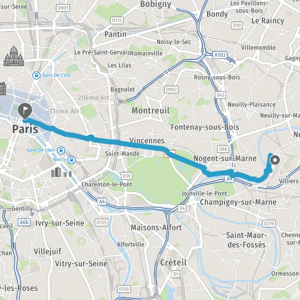 Prendre légèrement à droite la piste cyclable Avenue de Nogent et continuer sur 2,3 kilomètres