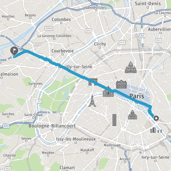 Prendre légèrement à droite la piste cyclable Rue de Rivoli et continuer sur 2,5 kilomètres