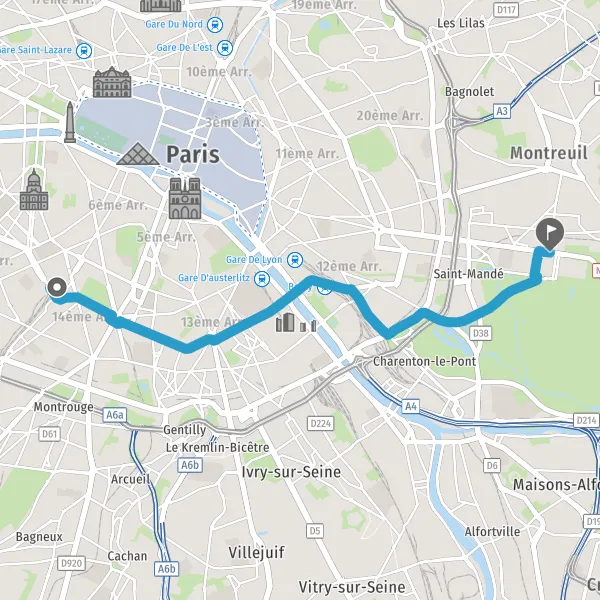 Prendre légèrement à droite la piste cyclable Avenue Daumesnil et continuer sur 2,1 kilomètres